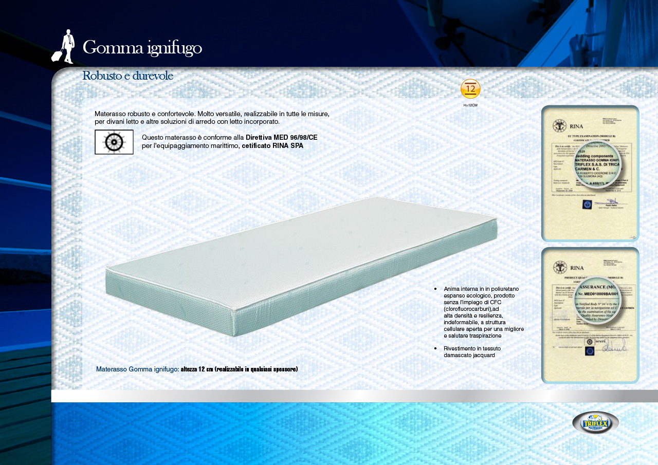 questo materasso è conforme alla Direttiva MED 96/98/CE, per l’equipaggiamento marittimo,certificato RINA SPA.